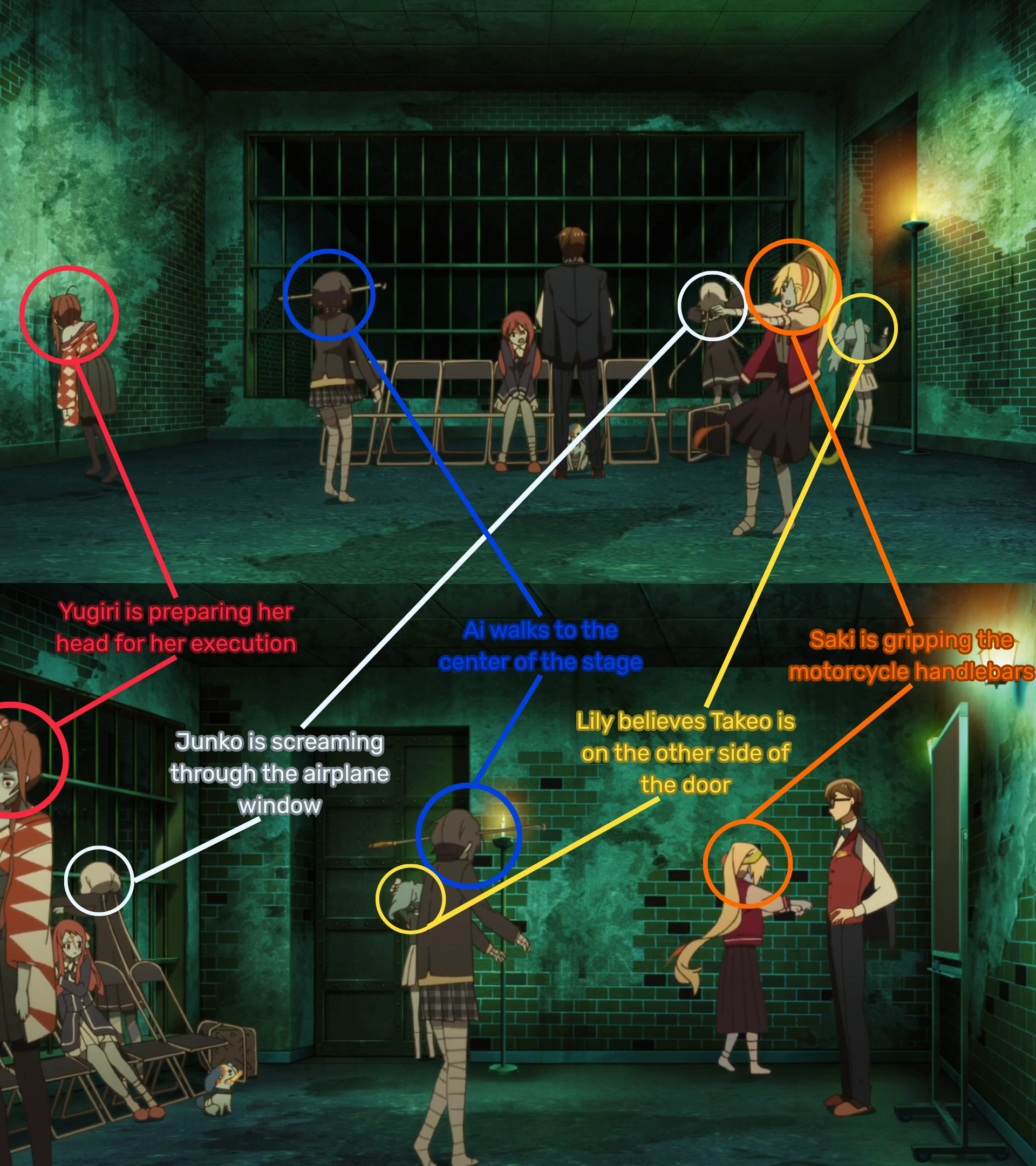 As shown in Episode 1, we see the mindless zombies (excluding Sakura by that time) wandering around the basement where their daily meetings are held. While it can easily be overlooked as aimless wandering as typical zombies do, it is worth noting that each member of the group is actually taking specific actions that are tailored to what happened to them at the time of their death.
